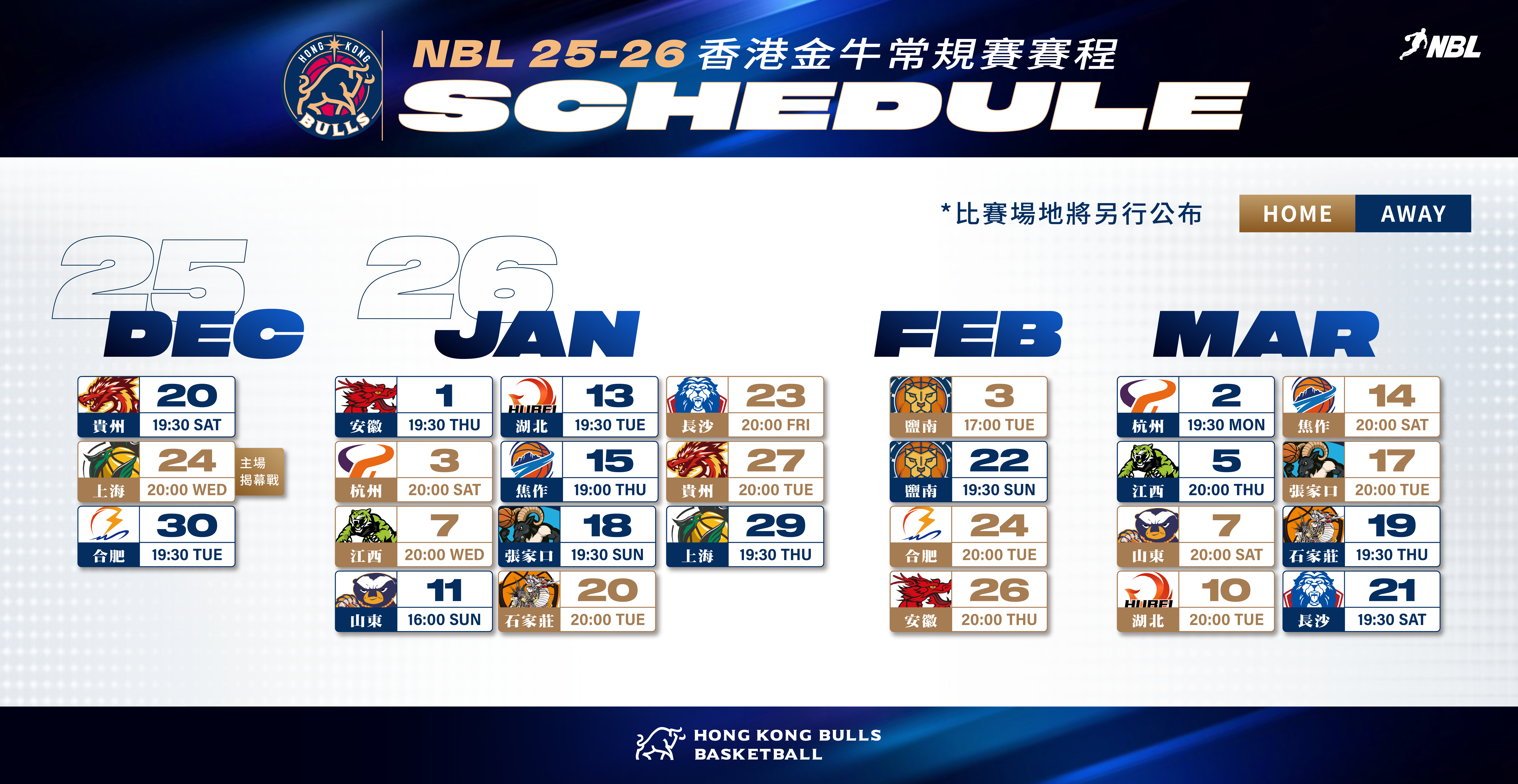 2025/26 全國男⼦籃球聯賽(NBL)今⽇舉⾏新賽季發佈會,正式公布新賽季的參賽球隊名單、賽制及多項重要安排。新賽季賽程將於 12 ⽉ 20 ⽇正式展開,作為衛冕之師的香港⾦⽜將於揭幕戰率先亮相,作客鬥貴州猛龍。屆時賽會亦將舉⾏上季總冠軍戒指頒贈儀式,為新⼀季賽事揭開序幕,象徵新⼀輪冠軍爭奪正式展開。香港⾦⽜期望以勝仗打響新季頭炮,邁出衝擊第三座 NBL 總冠軍獎盃的第